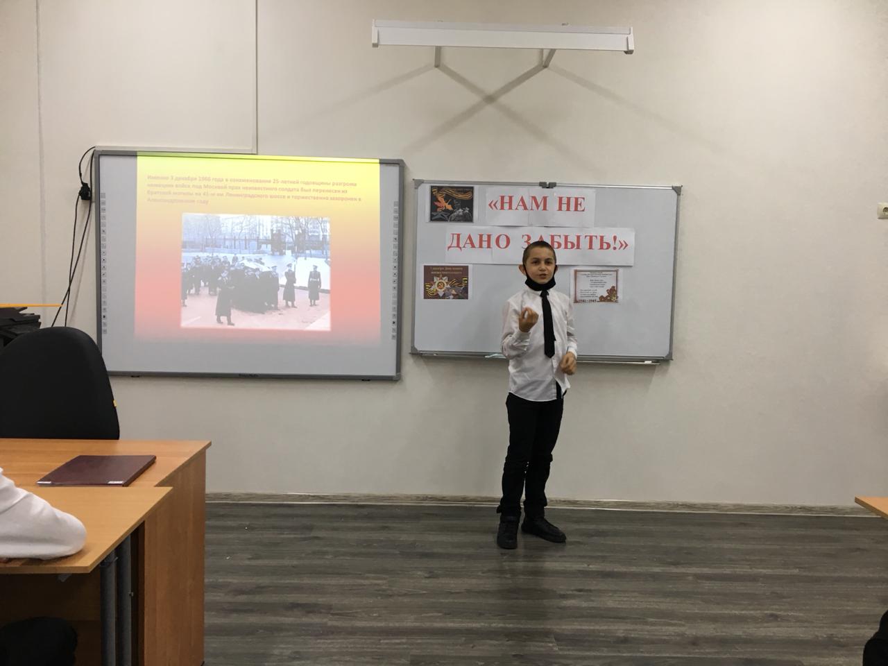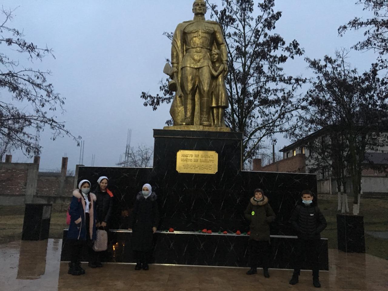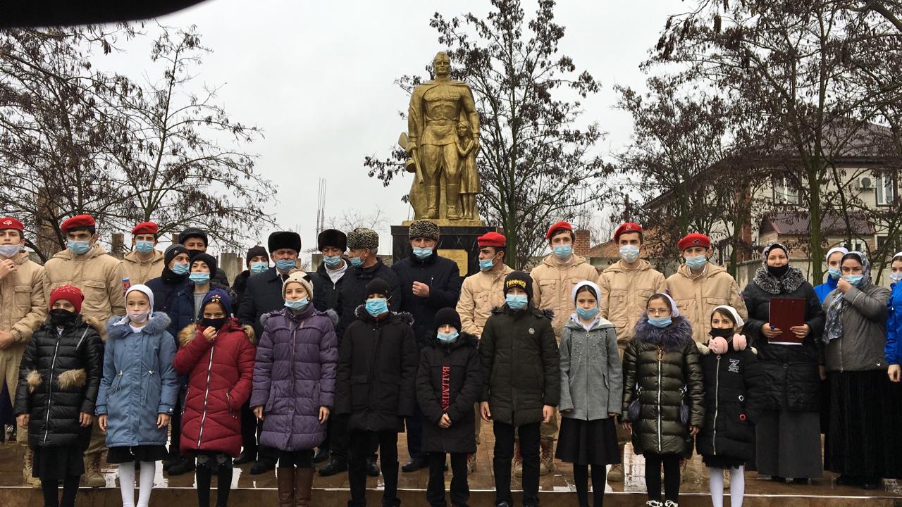 02.12.2020Дорогие друзья! 3 декабря 2014 года в нашей стране появился новый праздник - День неизвестного солдата. Это сравнительно новая памятная дата в российской истории, отмечаемая ежегодно – 3 декабря. Этот памятный день призван увековечить память, воинскую доблесть и бессмертный подвиг советских и российских воинов, которые погибли в боевых действиях и чьи имена остались неизвестными.С целью формирования чувства патриотизма, уважения и благодарности к подвигу воинов ВОВ, учителем истории Джебирхановой З.А. в 7б классе был проведен урок мужества «Нам не дано забыть», а также активисты ЧРОО ЕДЮО «Юные Кадыровцы» МБОУ «Шелковская СОШ4 им.А-Х.Кадырова» приняли участие в акции возложения цветов к памятнику воинам, павших в ВОВ (1941-1945гг.)