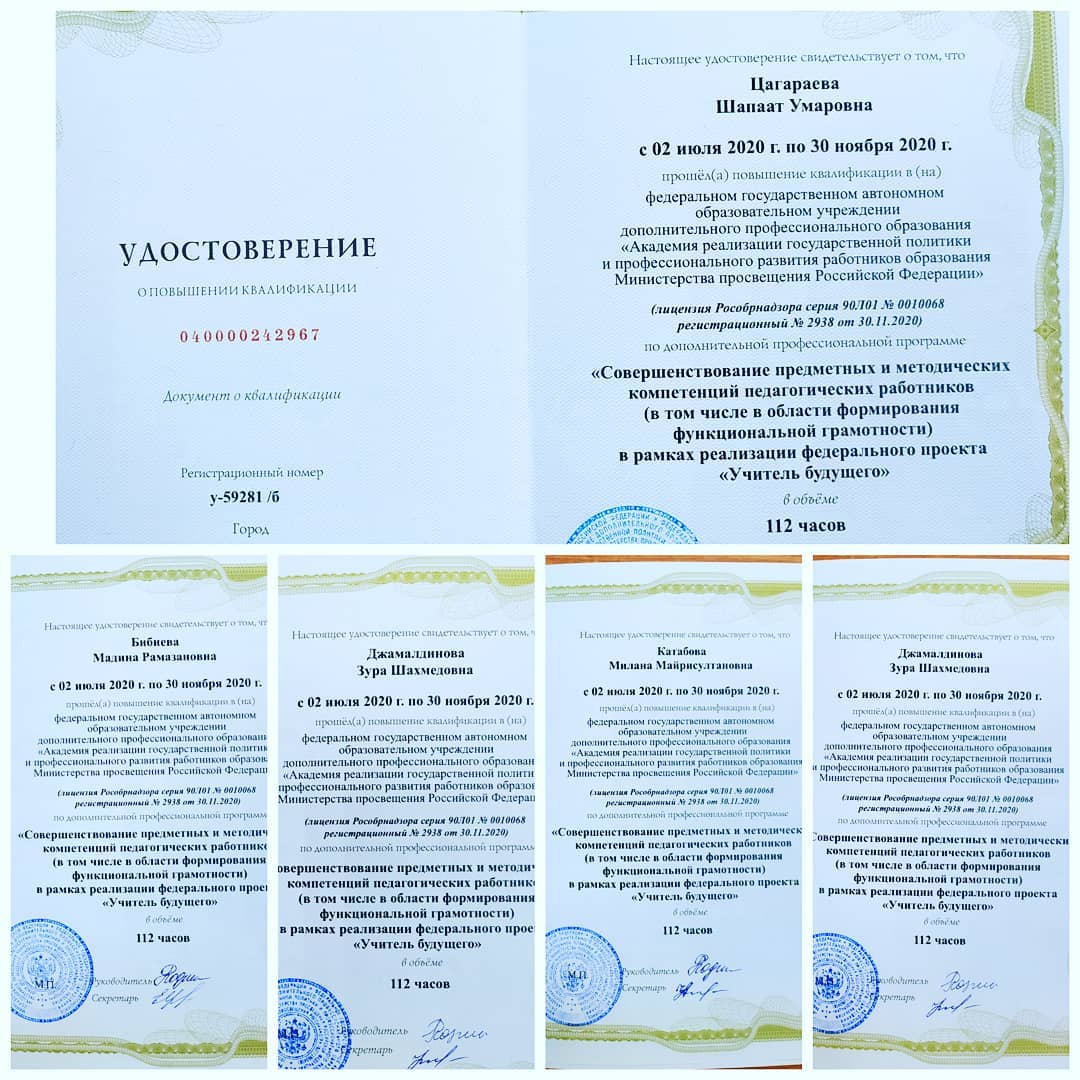 23.02.2021С 02.07.2020 г. по 30.11.2020 г. учителя МБОУ "Шелковская СОШ 4 им. А-Х.Кадырова" прошли курсы повышения квалификации в Федеральном Государственном автономном образовательном учреждении дополнительного профессионального образования "Академия реализации государственной политики и профессионального развития работников образования Министерства просвещения РФ" по дополнительной профессиональной программе: " Совершенствование предметных и методических компетенций педагогических работников (в том числе формирование функциональной грамотности) в рамках реализации федерального проекта "Учитель будущего".