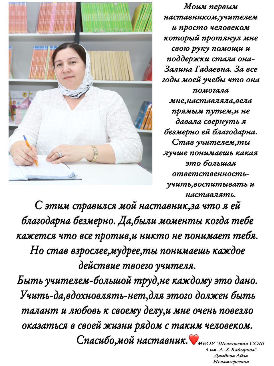 В рамках проекта "Год педагога и наставника "в МБОУ " Шелковская СОШ№4 им.А-Х.Кадырова" проходит Всероссийская акция "Учить.Вдохновлять.Развивать".